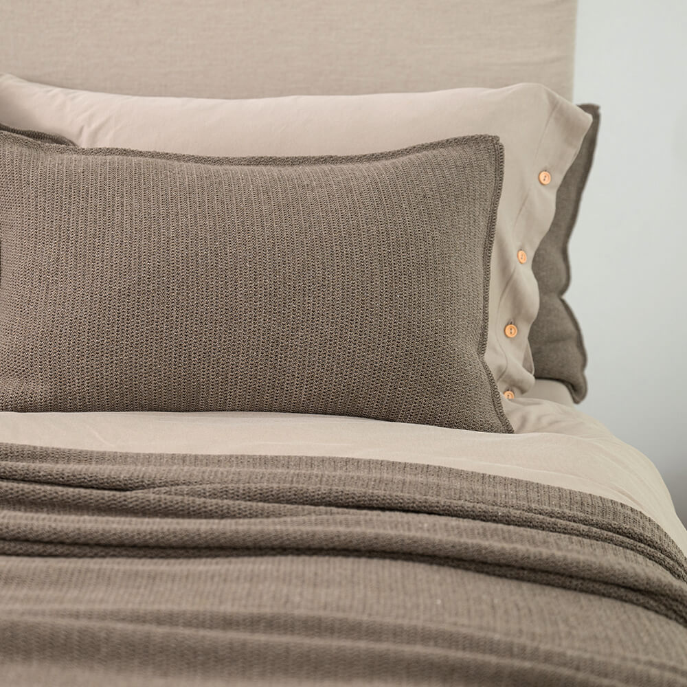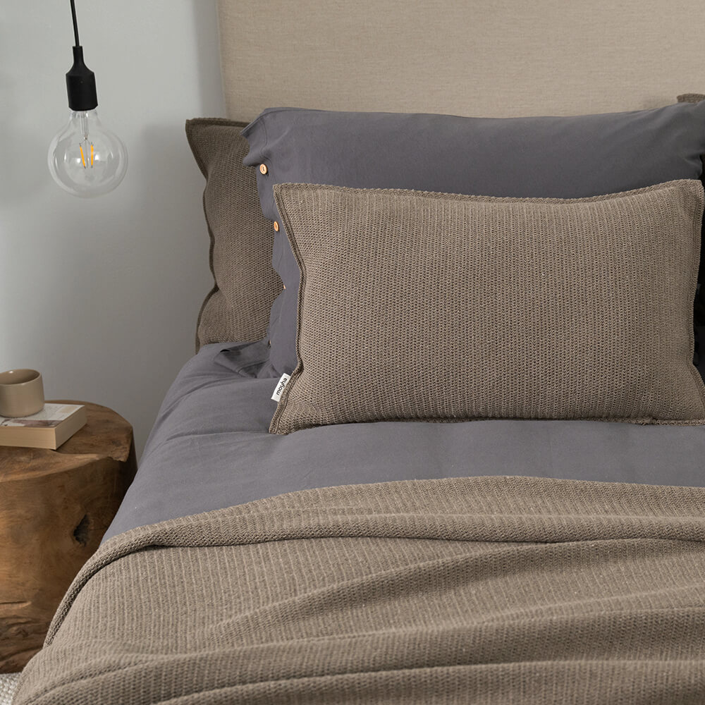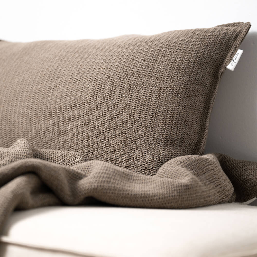 De bruine kleur waarin dit kussen is uitgevoerd is een koele, zachte tint, waarmee je makkelijk wat rust en warmte toevoegt aan je woon- of slaapkamer. Hou het geheel ingetogen door het langwerpige bruine kussen te combineren met andere neutrale kleuren zoals ecru, taupe of zand. Of ga voor een warme sfeer door te combineren met okergeel, olijfgroen en een toefje bordeauxrood. Dit staat ook geweldig in een urban jungle interieur. Ben je dol op ton-sur-ton en wil je je kussens, plaids en spreien met elkaar matchen? Bekijk dan ook de andere items uit de Close to Nature serie van Moyha!