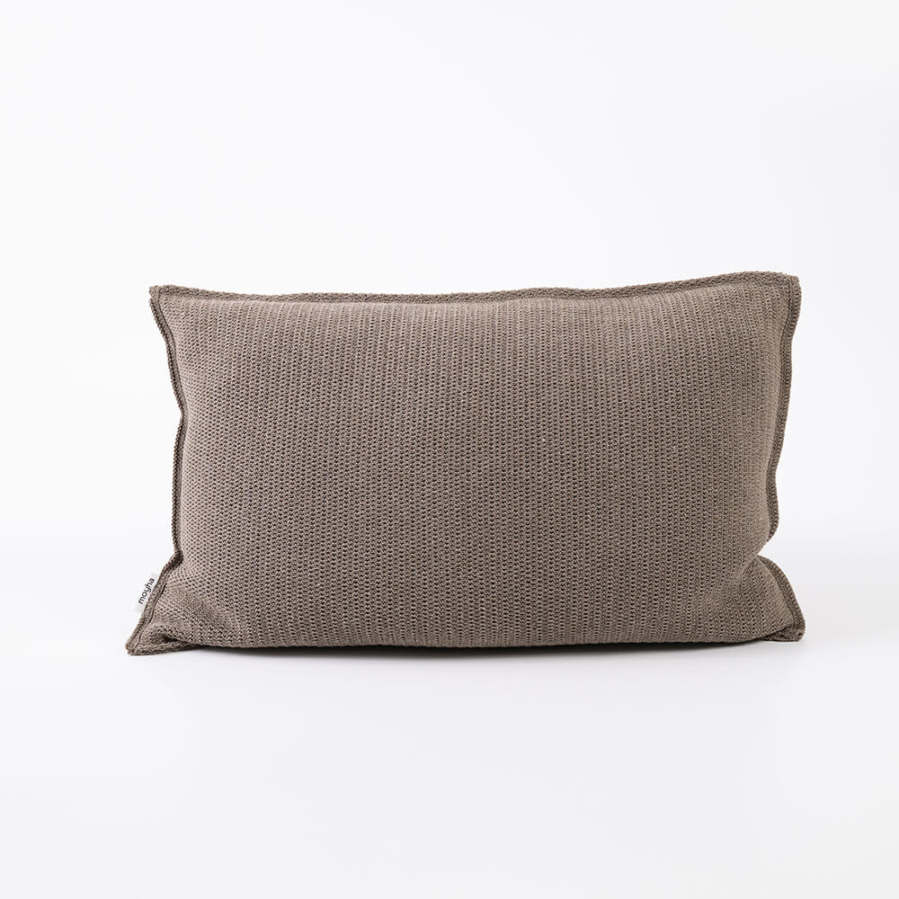 Het gebreide langwerpige bruine kussen is verkrijgbaar als losse kussenhoes of inclusief vulling.