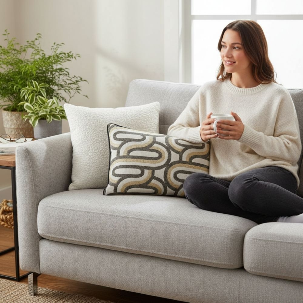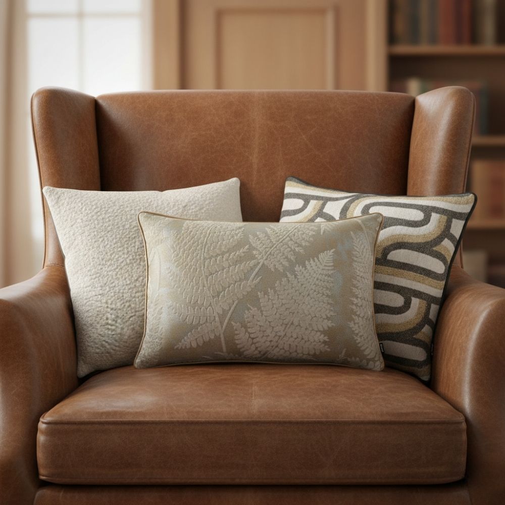 Met de kussens Winter Whisper geef je een neutrale bank in één keer die warme, luxe winterlook. De set bestaat uit drie kussens die elkaar perfect aanvullen: een zacht ivoor gewatteerd vierkant als rustige basis, een aaibaar varen-kussen met subtiele glans en koperkleurige piping voor verfijning, en een langwerpig grafisch kussen dat de set nét dat stoere accent geeft. Het resultaat is een combinatie die voelt als hotel chic: rustig, rijk en toch spannend door de mix van texturen.