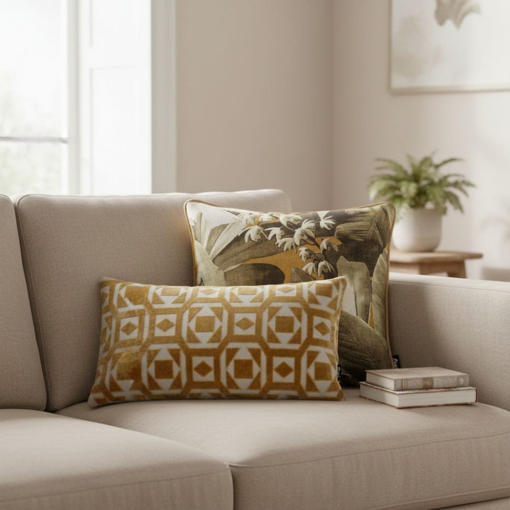 - Banana: Okergeel botanische print (40 × 40 cm) – duurzame meubelstof, gouden lederlook bies, ritssluiting.