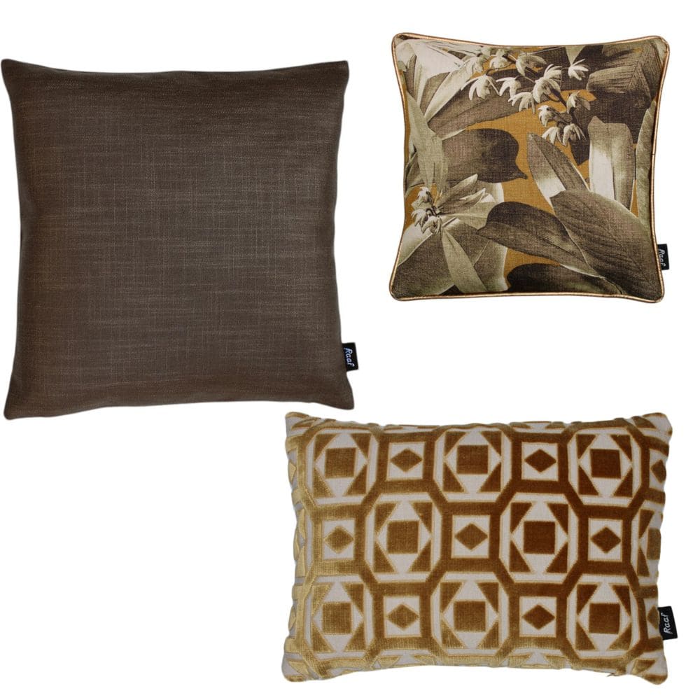 Met Cacao Sunlight haal je in één keer een warme, zonnige sfeer in huis: okergeel als blikvanger, botanische print voor een vleugje natuur en chocoladebruin als rustige, luxe basis. De set is perfect als je een neutrale bank nét wat meer karakter wilt geven zonder dat het onrustig wordt. Denk aan een woonkamer in beige, zand of taupe die warmer mag, of juist een interieur met grijs, groen, petrol of zelfs paars waar je een warme gloed aan wilt toevoegen.