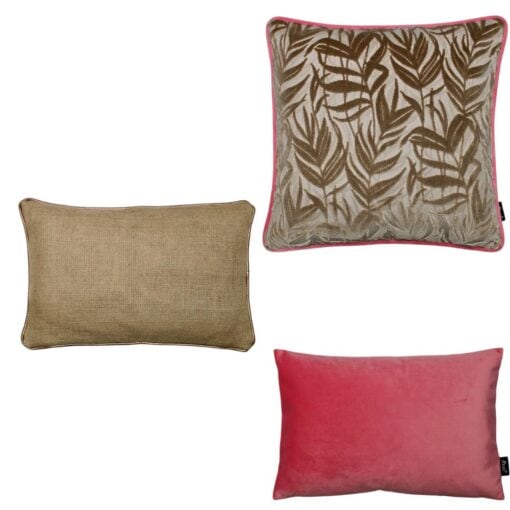 De set bestaat uit een vierkant beige kussen met subtiel plantenreliëf en opvallende roze bies, een stoer naturel jute kussen met koperkleurige lederlook bies (voor textuur), en een langwerpig roze velvet kussen dat zorgt voor zachtheid en glans. Deze combinatie staat prachtig op een neutrale bank (beige, ecru, zand, taupe of grijs), maar werkt ook heel goed met groen, mosterdgeel of donkerblauw voor extra contrast.