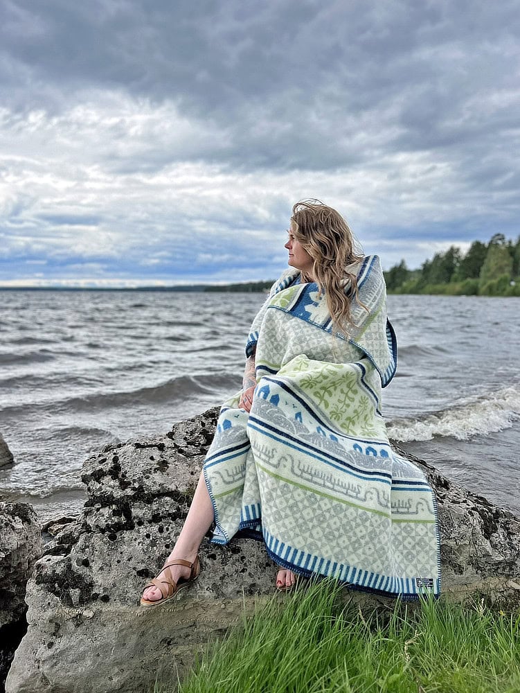 Met deze prachtige plaid in blauw, groen en grijs van lamswol haal je een unieke woondeken in huis, want de gave print steelt de show in je woonkamer! Dit bijzondere ontwerp is gemaakt door de Zweedse ontwerpster Kerstin Landström. Voor het patroon heeft Kerstin zich laten inspireren door rotsen, boothuisjes, de gebreide truien die de vissers dragen, kamperfoelie en de rotstekeningen die te vinden zijn in Tanumshede. Het resultaat is echt een plaatje, wat je direct doet wegdromen naar de Zweedse kust. Wij vinden het ‘hygge’!