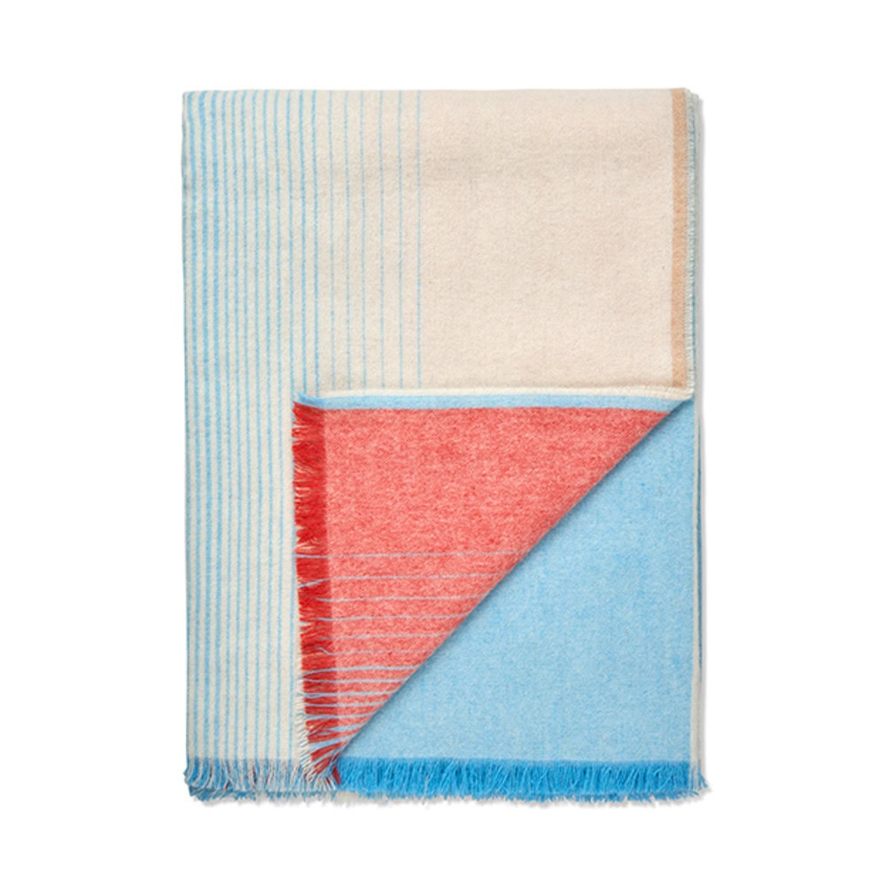 De plaid blauw wit uit de Carte Postale collectie van Elvang voelt als een frisse wandeling langs zee. Het zachte kleurverloop, van helder blauw naar licht zandwit met een warm rood accent aan de rand, brengt rust in huis terwijl het tegelijkertijd een vleugje lef toevoegt. Deze plaid is soepel, lichtgewicht en heerlijk zacht dankzij de mix van alpaca en wol. De korte franjes geven hem een verfijnde afwerking. Het kleurverloop lijkt bijna als waterverf in elkaar over te vloeien, waardoor de plaid een serene en luchtige uitstraling heeft die elke ruimte een ontspannen sfeer geeft.
