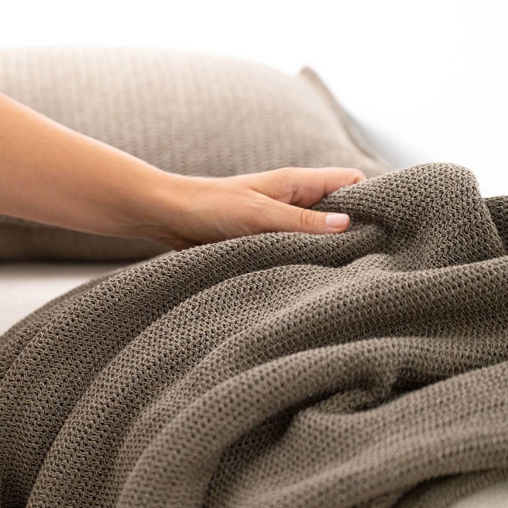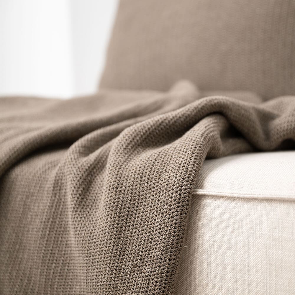Deze gebreide plaid in bruin is van het Poolse merk Moyha. Dit merk is opgericht door twee dames die alles zelf ontwerpen en de productie in eigen beheer houden. Moyha staat bekend om het gebruik van warme, natuurlijke kleuren, hoogwaardige en duurzame materialen en de zachte, luxe uitstraling van de producten.