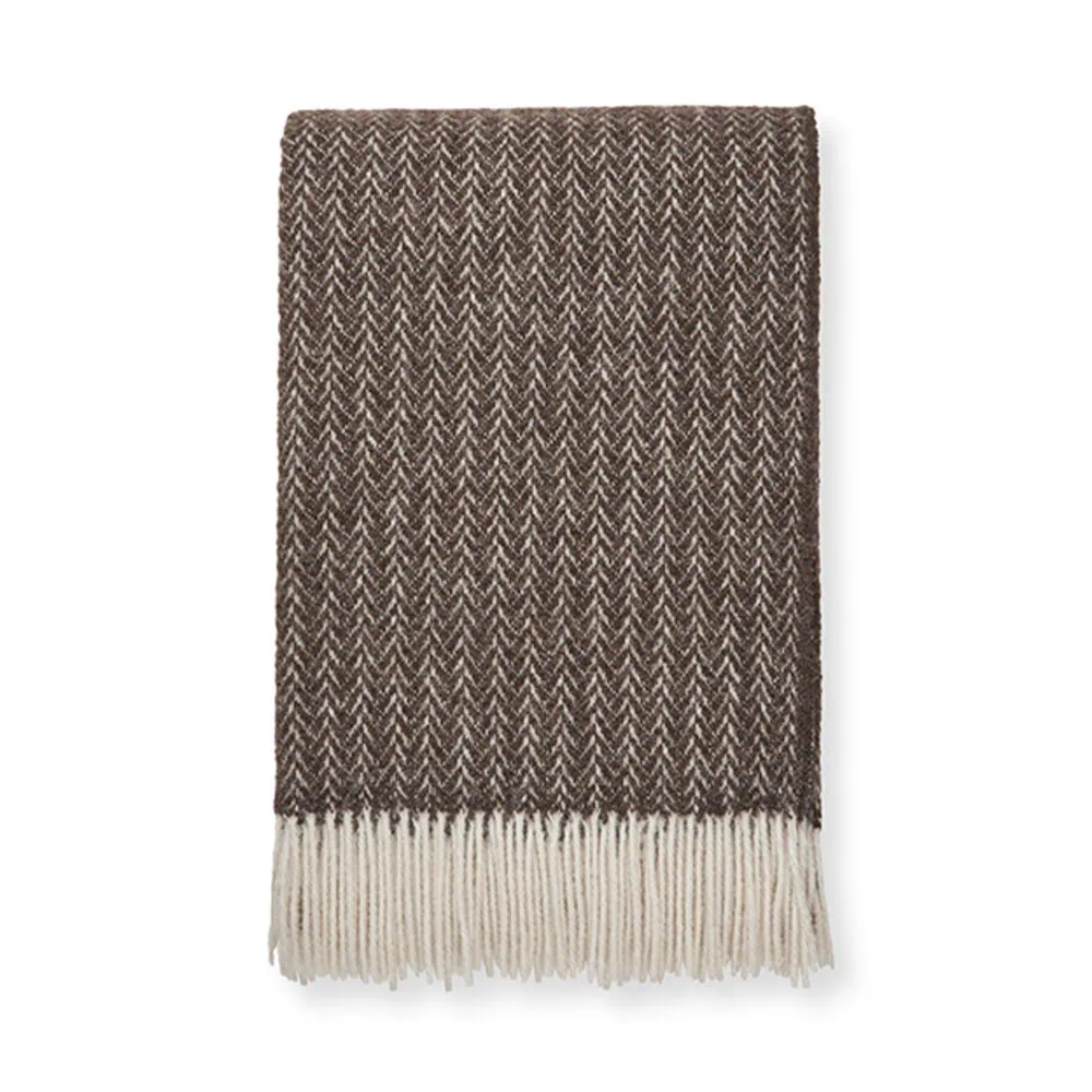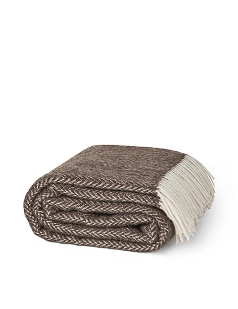 Deze bruine wollen plaid is van het Deense merk Elvang. Elvang staat bekend om zijn duurzame materialen en verfijnde afwerking; elk stuk wordt met zorg geweven voor jarenlang woonplezier.