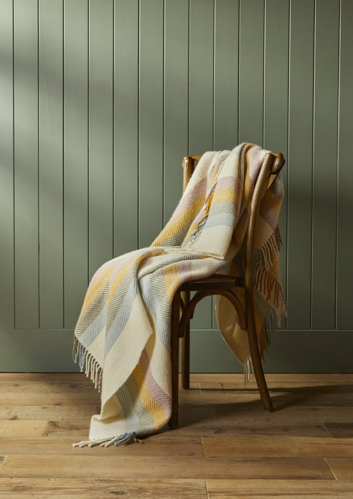 Deze plaid is uitgevoerd in een kleurstelling die ze Primrose hebben genoemd. Deze laat zich het beste omschrijven als een crèmekleurige basis, met pastelversies van lichtblauw, olijfgroen, okergeel en oudroze. Ondanks de vele kleuren is het eindresultaat een fijne, uitgebalanceerde plaid. Dit maakt ‘m perfect voor rustige woonkamers met veel neutrale kleuren zoals beige en bruin. Dan geeft de plaid een vleugje kleur en gezelligheid zonder dat het ten koste gaat van de ingetogen uitstraling van je interieur. Maar ook wanneer je dol bent op kleur is dit een geweldige plaid. Combineer ‘m bijvoorbeeld met één van de kleuren die je er al in terugvindt, benadruk je favoriete tint van het stel of kies voor contrast en combineer ‘m met diepe tinten.