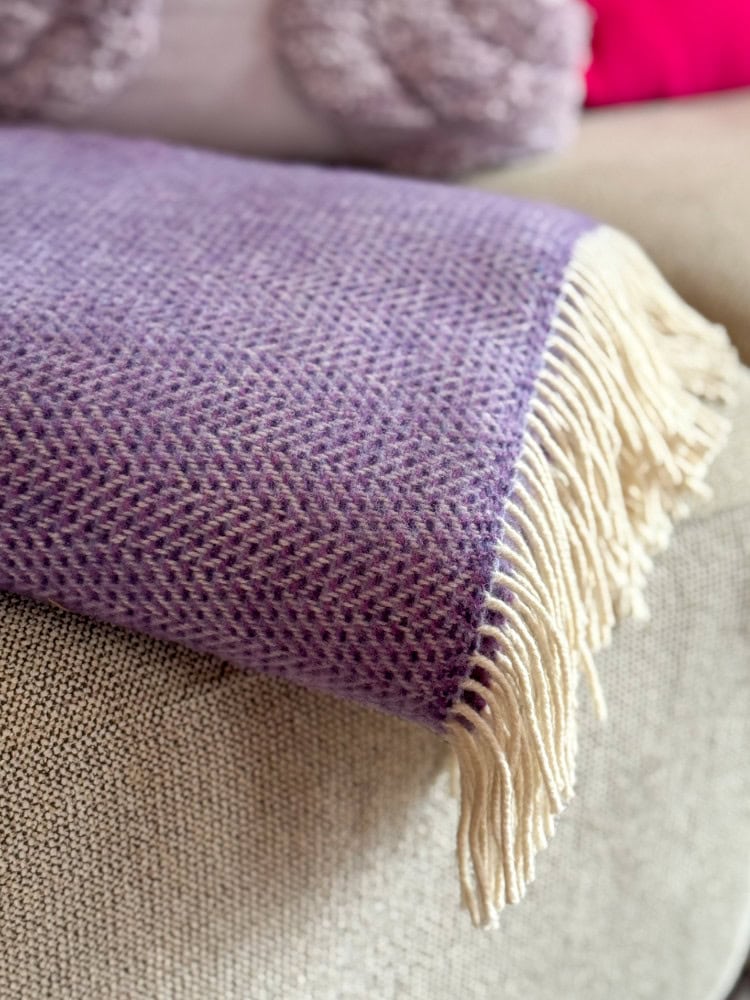 Deze plaid in lila van cashmere en merinowol is van het merk John Hanly. Dit Ierse familiebedrijf weeft al vier generaties de mooiste wollen producten. En dat jarenlange vakmanschap is terug te zien in de kwaliteit: een plaid van John Hanly is er één waar je jarenlang plezier van hebt.