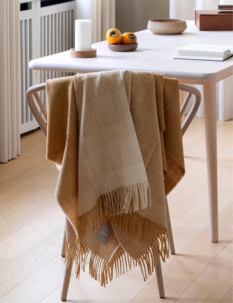 Het warme gele kleurverloop past prachtig in interieurs met veel natuurtinten zoals zand, beige, taupe, bruin en warm grijs. Maar ook in moderne interieurs met veel wit of een donkere bank brengt deze plaid een stijlvol, kalm accent. De Horizon serie is geïnspireerd op het subtiele spel van licht en schaduwen in de natuur, en dat zie je terug in de verfijnde overgangen en de ingetogen uitstraling.