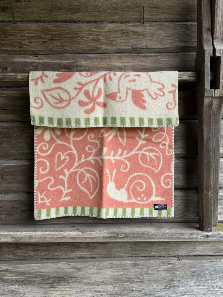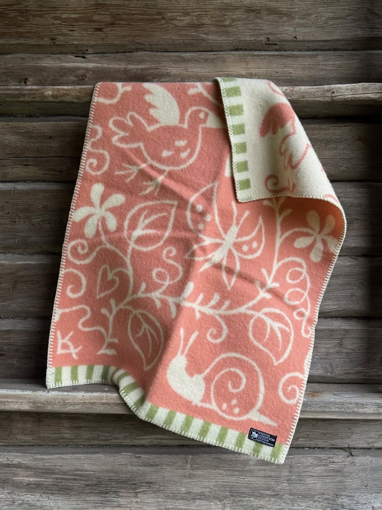 Met deze wiegdeken in roze van Klippan voeg je een vleugje warmte en tederheid toe aan de babykamer. Deze 100% lamswollen deken heeft een lief patroon met diertjes en plantjes erop, en is ontworpen door de Zweedse ontwerpster Kerstin Landström. De ene kant is roze met de tekeningen in het wolwit, en de andere kant is precies andersom. Zo kun je nog eens wisselen want door ‘m om te draaien en heb je meteen een ander effect in het wiegje. Deze wiegdeken is gemaakt van zachte lamswol en is afgewerkt met een stoere festonsteek. De wollen wiegdeken heeft een maat van 65 cm bij 95 cm. Dit is een perfecte maat voor in de wieg, maar deze babydeken is ook superhandig voor onderweg in de auto, wandelwagen of maxi cosi.