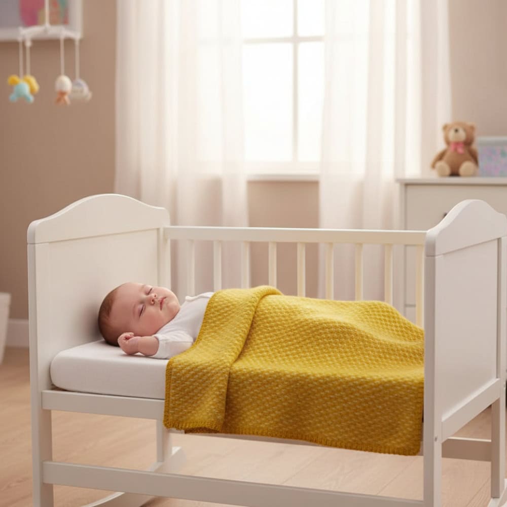 De kleur van deze wiegdeken is het beste te omschrijven als een vrolijk okergeel. Match de deken met andere kleuren uit de babykamer, heel leuk als het geel terugkomt in de overige accessoires. Deze okergele wiegdeken staat prachtig in een mooi wiegje van hout of een wit geschilderde wieg waarin de warme kleur mooi naar voren komt. Maar hij kan ook heel mooi een zonnig accent geven in een wiegje in een fellere kleur.